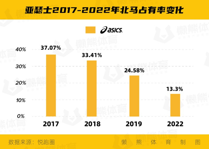 在国外品牌中,下降势头最明显的要数亚瑟士。2017年,亚瑟士势头还算不错,这一点从北马跑鞋品牌的占有率就可见一斑——2017和2018年均高居最受欢迎跑鞋头名。但遗憾的是,这些年亚瑟士在中国市场正在掉队,声量也似乎越来越弱,这一次北马跑鞋占有率再次变成了亚瑟士在华势头的晴雨表:表面上看,亚瑟士在占有率排名中仍居第二,但占有率已经从2017年的37.07%降至今年的13.3%,一个更直观的数据是,在今年北马3小时内完赛的精英跑者中,亚瑟士的占有率排名仅列第七,只有0.9%,而这个数字在2018年,是12.6%。