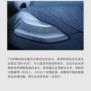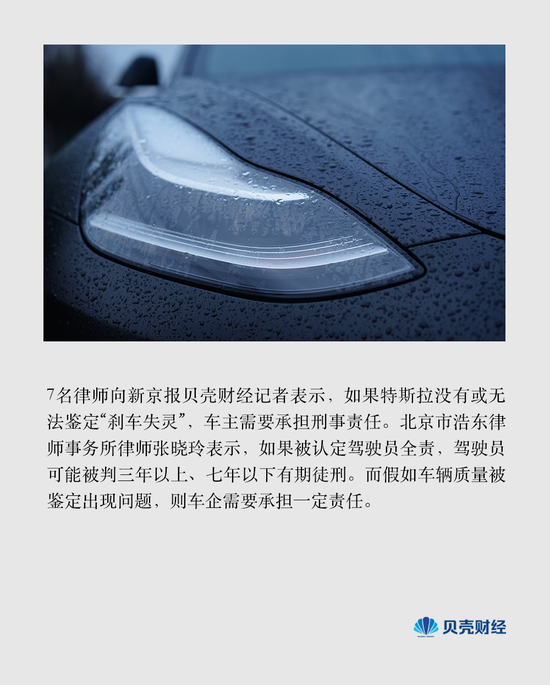 就此,7名律师向新京报贝壳财经记者表示,如果特斯拉没有或无法鉴定“刹车失灵”,车主需要承担刑事责任。北京市浩东律师事务所律师张晓玲表示,如果被认定驾驶员全责,驾驶员可能被判三年以上、七年以下有期徒刑。而假如车辆质量被鉴定出现问题,则车企需要承担一定责任。