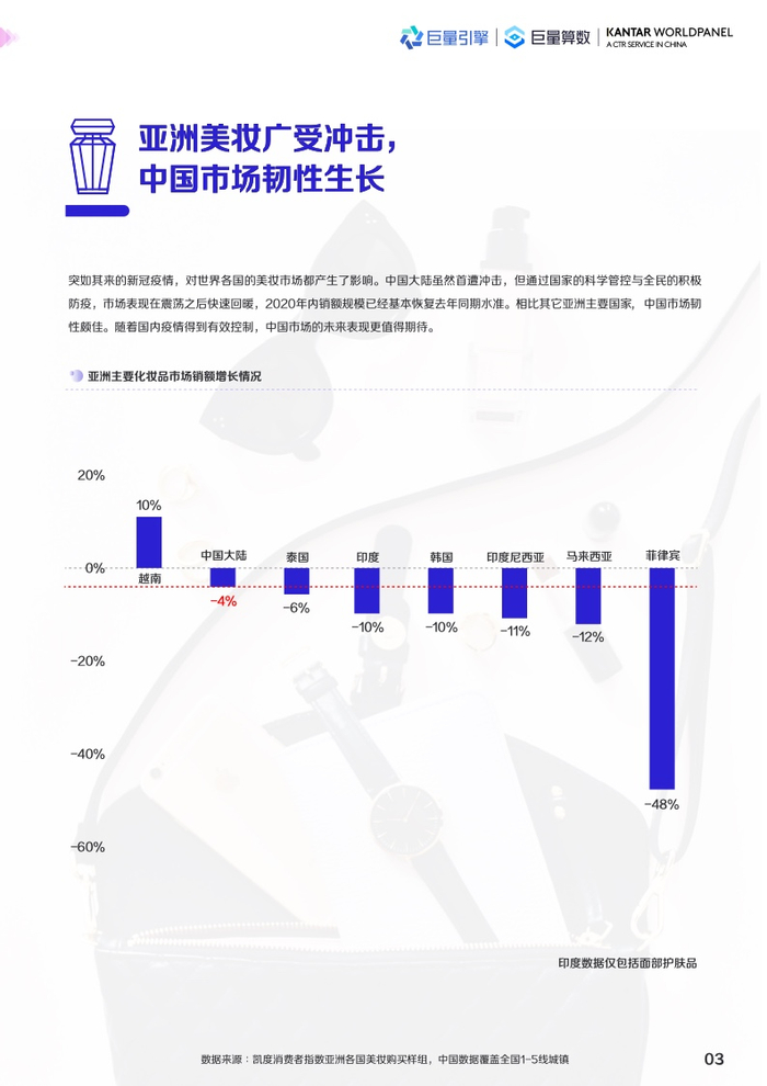 2020年疫情席卷全球,全球美妆市场受到冲击,下行8.9%。伴随着全球进入新常态管理状态,2021年全球美妆市场规模为18.3千亿人民币,增速强势反弹(增长6.2%),逐步向疫情前的市场规模靠拢,趋势向好。