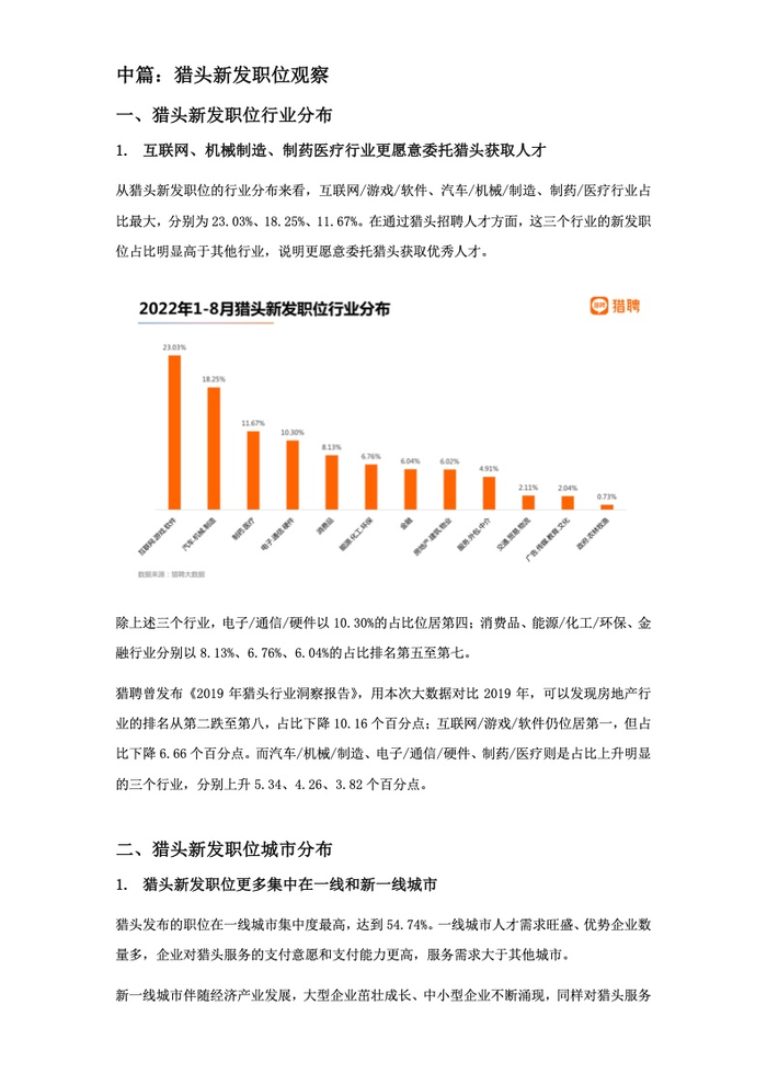 从猎头新发职位的行业分布来看,互联网/游戏/软件、汽车/机械/制造、制药/医疗行业占比最大,分别为23.03%、18.25%、11.67%。在通过猎头招聘人才方面,这三个行业的新发职位占比明显高于其他行业,说明更愿意委托猎头获取优秀人才。