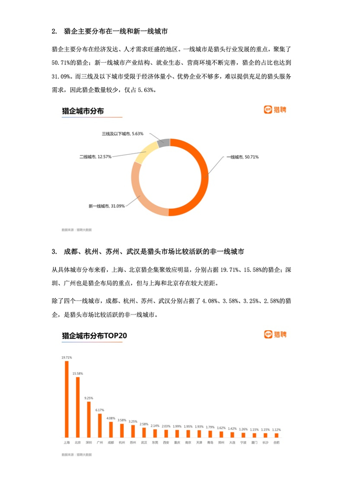 从具体城市分布来看,上海、北京猎企集聚效应明显,分别占据19.71%、15.58%的猎企;深圳、广州也是猎企布局的重点,但与上海和北京存在较大差距。