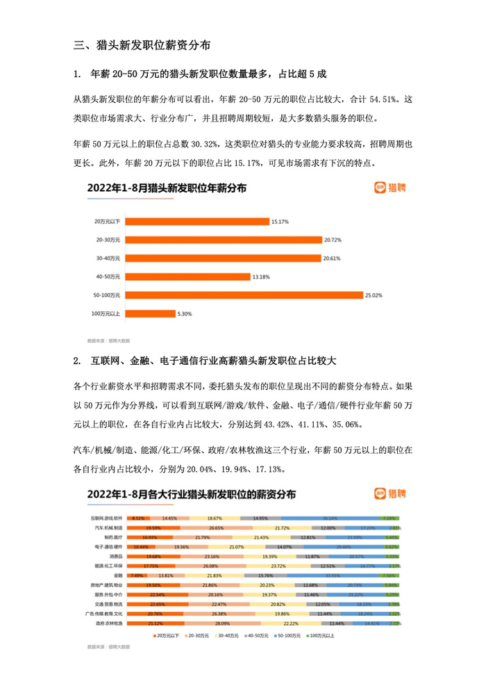 从猎头新发职位的年薪分布可以看出,年薪20-50万元的职位占比较大,合计54.51%。这类职位市场需求大、行业分布广,并且招聘周期较短,是大多数猎头服务的职位。