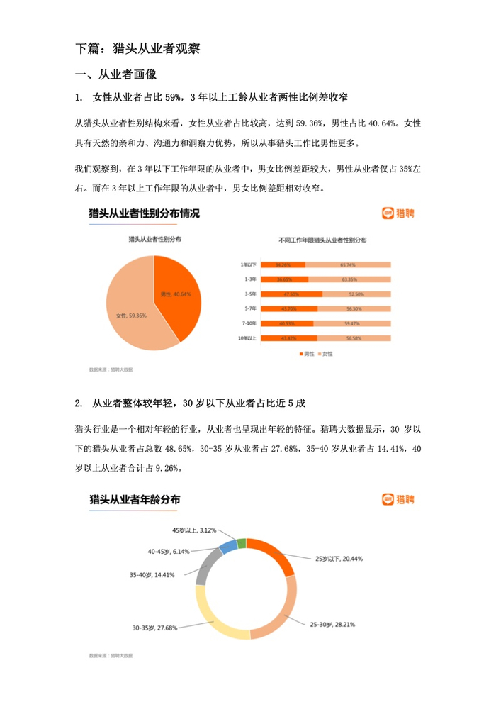 猎头行业是一个相对年轻的行业,从业者也呈现出年轻的特征。猎聘大数据显示,30岁以下的猎头从业者占总数48.65%,30-35岁从业者占27.68%,35-40岁从业者占14.41%,40岁以上从业者合计占9.26%。