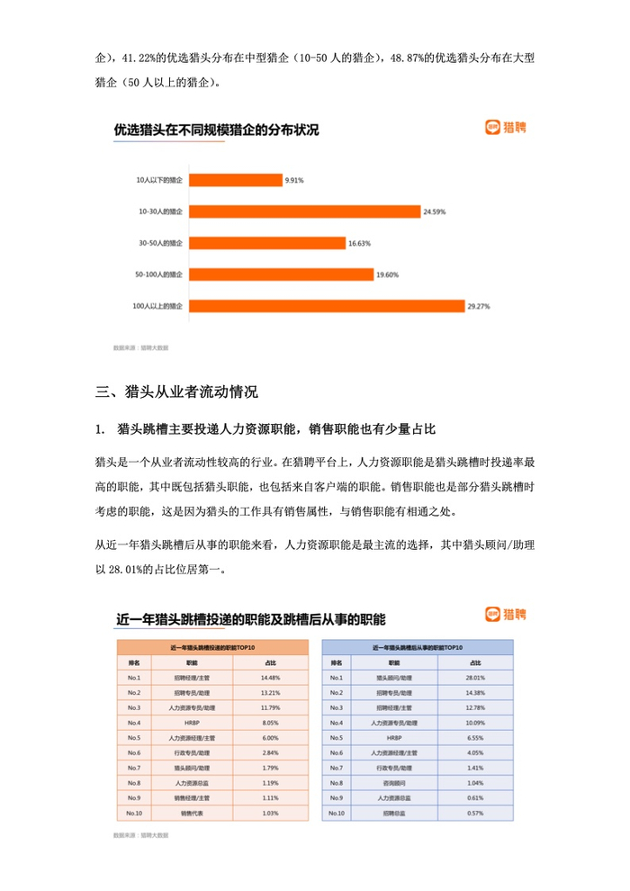 除了四个一线城市,杭州、苏州、成都、武汉、南京也是猎头服务需求较大的城市,猎头新发职位占比分别为5.42%、4.16%、2.64%、2.49%、2.49%。