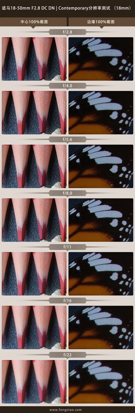 通过实际拍摄,可以发现适马18-50mm F2.8 DC DN | Contemporary在18mm端光圈全开的情况下,中心保持了非常高的锐度表现,而边缘的画质略显松散,收缩两挡光圈之后边缘的画质提升非常明显。整体来说,使用这支镜头在18mm端进行拍摄,无非就是风光大场景或者是近距离的特写等题材,而这两种题材都需要灵活的来更改光圈值,拍摄风光不会用到小光圈,近距离拍摄用大光圈,边缘部分大部分的情况下都是虚化的,所以我个人觉得适马18-50mm F2.8 DC DN | Contemporary在18mm的分辨率表现绝对是经过设计师优化衡量过的结果。