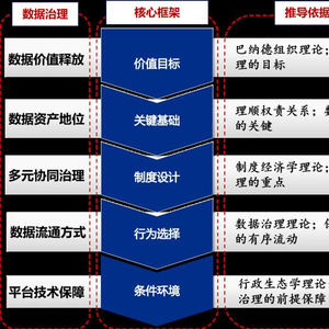 数据治理的核心框架从价值目标到条件环境是一个自上而下的推导过程,数据价值释放为数据治理提供了远景和方向,数据资产地位确立提供了关键基础,多元协同治理提供了动力,数据开放共享提供了实现路径,而平台技术保障提供了保障。从而,整个过程形成逻辑闭环,构成了数据治理的核心框架,保证了数据治理体系不断完善,实现迭代发展。
