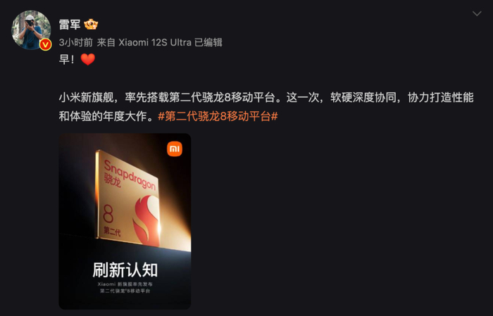 小米集团创始人雷军透露,骁龙 8 Gen2 将由小米新旗舰率先搭载。