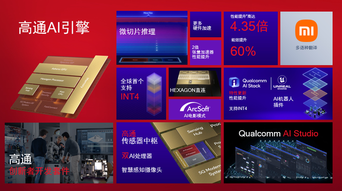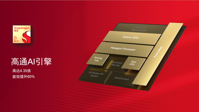 据介绍,第二代骁龙8为整个系统提供了开创性的AI技术。在升级的高通Hexagon 处理器支持下,用户能够体验更快速的自然语言处理所带来的多语种翻译和先进的AI影像特性。Hexagon处理器实现全新架构升级,包括微切片推理,和一个更大的张量加速器带来高达4.35倍的AI性能提升,能效提升达60%。