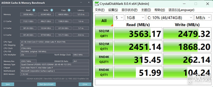 存储配置方面,这款轻薄本配有2根,在AIDA64的内存条性能测试中显示,单通道8GB内存的内存读取速度为59598MB/s,写入速度63348MB/s,内存复制速度68650MB/s,硬盘配备的是512GB容量的SSD,在CrystalDiskMark测试中显示其最大读取速度为3563.17MB/s,写入速度为2479.32MB/s。