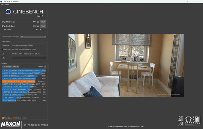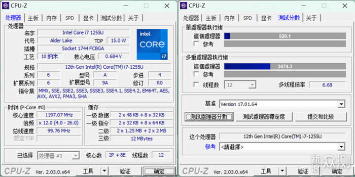 外观介绍完毕,我们来看一下这款轻薄本的性能配置,CPU是英特尔酷睿i7 1255U,移动平台的10nm制程工艺,支持10核心12线程,10核分别是两个性能核心和8个能效核心,在轻薄本领域中属于高端级别的处理器,CPU-Z的单核分数为520.1,多核分数为3474.3,在CineBench R23的跑分成绩则是单核1135pts,多核7796pts。
