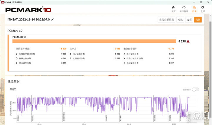 鉴于轻薄本主攻方向是续航而非提供极致性能,因此我们着重看一下Surface Laptop 5的办公性能和续航以及单烤能耗表现就行了,首先在PCMark 10的综合性能测试中,这款轻薄本的基础得分为8209分,生产力得分为5425分,数字内容创作得分为4771分,总分为4278分,这个成绩表明性能方面它能满足用户日常办公的使用需求。