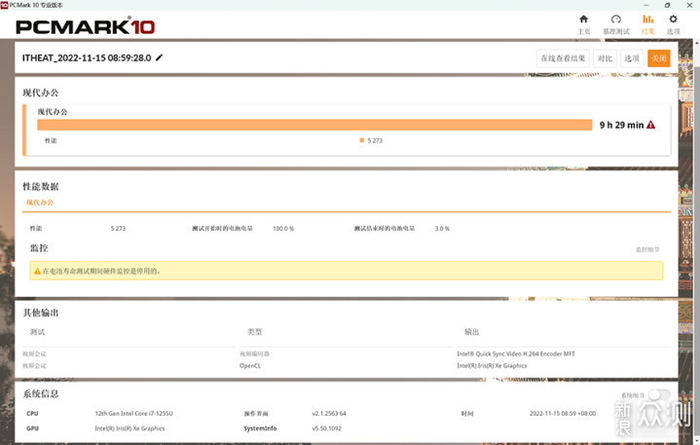 官方宣传这款笔记本的电池续航最长可达18小时,不过18小时肯定不是多数打工人日常使用的环境,相对来说PCMark 10的电池续航测试成绩更有参考意义,背光键盘的应用会对笔记本的续航成绩造成一定的影响,因此续航测试的环境我们将轻薄本的键盘背光功能关闭,屏幕亮度设定在70%,并且电脑关闭节电模式,在这个日常使用状态下,笔记本从满电到电量耗完历时9小时29分钟,一天高强度的办公应用是没有任何问题的。