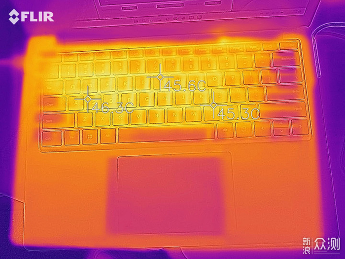 再来看一下单烤成绩,30分钟的单烤下,笔记本C面常用的WSAD按键区域温度为46.3℃,C面中间的区域也发热明显,CPU的温度控制在60℃上下,功耗基本维持在15W以内,调度策略上可以说是相当保守了,当然作为一款办公向的轻薄本,续航的权重要远高于性能,这也是可以理解的。