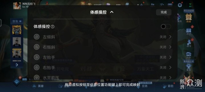 其次,利用陀螺仪和传感器等芯片的特性,将体感操控带入游戏中,通过左倾斜、右倾斜、左抬手、右抬手、水平前压和水平后压等体势来进行按键映射。