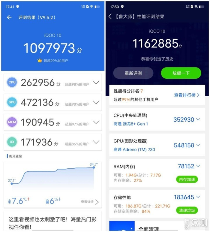 跑分表现,安兔兔来了1097973分,鲁大师也跑到了1162885分,CPU和GPU的基本超越了百分之九十八以上的用户,性能相当给力!