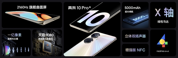 性能部分,真我10 Pro+搭载天玑1080旗舰芯,它采用台积电6nm先进制程,带来高性能低功耗的均衡表现,能够稳定运行王者荣耀90帧模式。67W智慧闪充+5000mAh超大电池的闪充长续航组合下,真我10 Pro+机身薄至仅7.78mm,更有X轴线性马达、立体双扬声器、多功能增强版NFC、车道级双频GPS导航、屏下光感指纹等旗舰体验,真正卷到极致!真我10 Pro+还是首款出厂即搭载realme UI 4.0的真我手机,带来全新的智能交互体验,更流畅、更高效、更智能。
