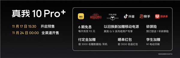 真我10 Pro+与真我10 Pro将于11月17日15:30正式开启预售,11月24日0点,线上线下全渠道正式开售。参与线上预售享6期免息分期,购买真我10 Pro+还可以加赠一年碎屏险,线下门店购机更有首销惊喜福利。