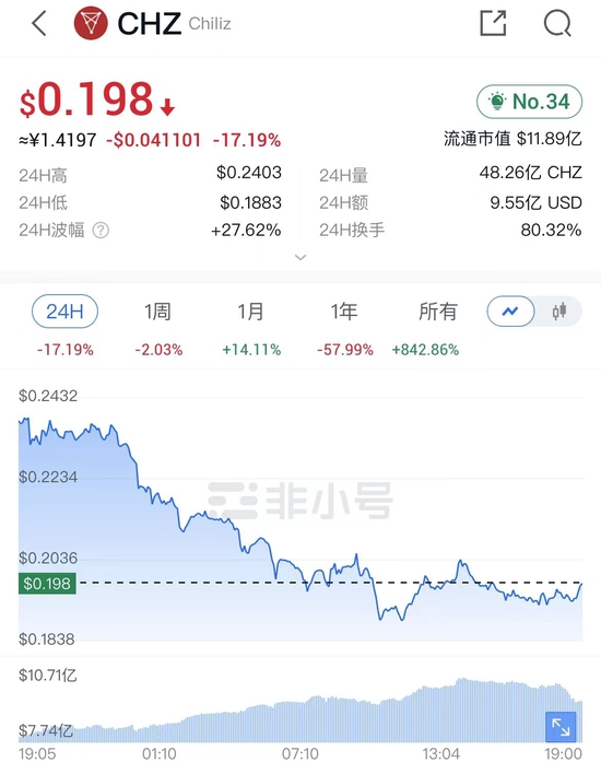 截至发稿,全球市值最大的世界杯概念币CHZ下跌17.19%,报0.198美元;巴西国家队粉丝代币BFT下跌17.2%,报收0.81美元;西班牙国家队粉丝代币SNFT下跌27.40%,报0.3248美元;葡萄牙国家队粉丝代币POR下跌14.93%,报4.73美元;阿根廷国家队粉丝ARG代币跌13.21%,报6.64美元;法国国家对粉丝代币FRA下跌7.5%,报收0.00057美元。