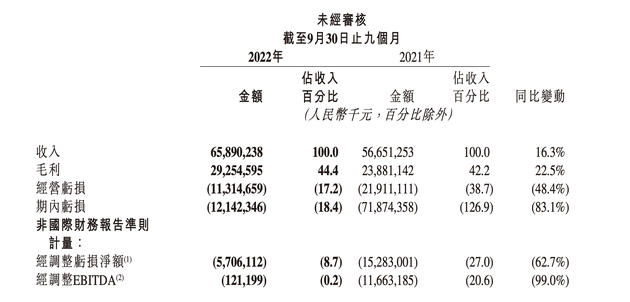财报显示,2022年前三季度快手总营收约为658.9亿元,同比增长16.3%;经调整后净亏损约为57.1亿元,同比减亏62.7%;其中,第三季度快手总营收同比增长12.9%至231亿元,经调整后净亏损约6.72亿元,同比减亏85.4%。