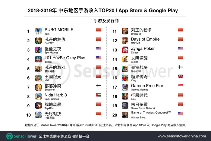 移动市场分析机构Sensor Tower曾在2019年公布了一份中东地区的手游收入榜单,主要统计了比较有代表性的土耳其、沙特和阿联酋三个市场中,2018至2019年各手游的收入排行。