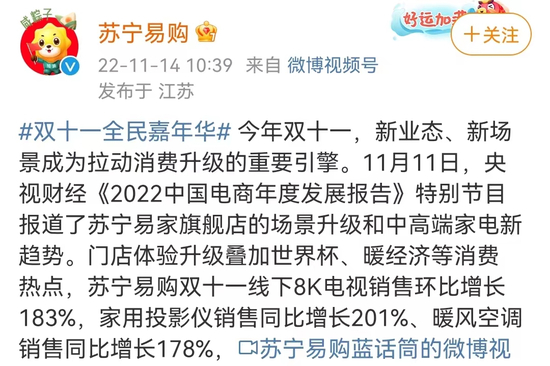 眼下,和其他零售企业一样,苏宁也将刚刚过去的“双11”作为今年四季度的重要发力点。“双11”开启前,苏宁易购宣布与美团达成战略合作,旗下超600家门店入驻美团。平台数据显示,截至11月1日,苏宁易购在美团平台订单量超45000单。与此同时,线下门店也实现了万元以上高端家电销售环比增长137%、智能家电销售环比增长143%的成绩。