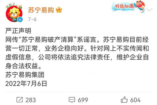 事实上,今年以来诸如苏宁易购破产清算、被收购的传言已经不是第一次出现了。今年7月6日凌晨,苏宁易购在官方微博中发表声明称网传“苏宁易购破产清算”系谣言,并表示公司经营一切正常。数月后,11月9日,苏宁易购再次发声否认网传“被供销社收购”传闻。