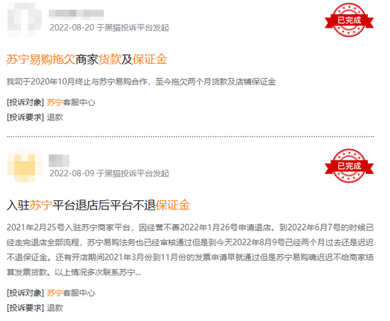 尽管当事人频频否认,但也一定程度上折射出外界对苏宁命运的揣测和隐忧。北京商报记者在黑猫投诉平台中看到,不少商家和供应商在平台上投诉苏宁易购拖欠保证金、货款。