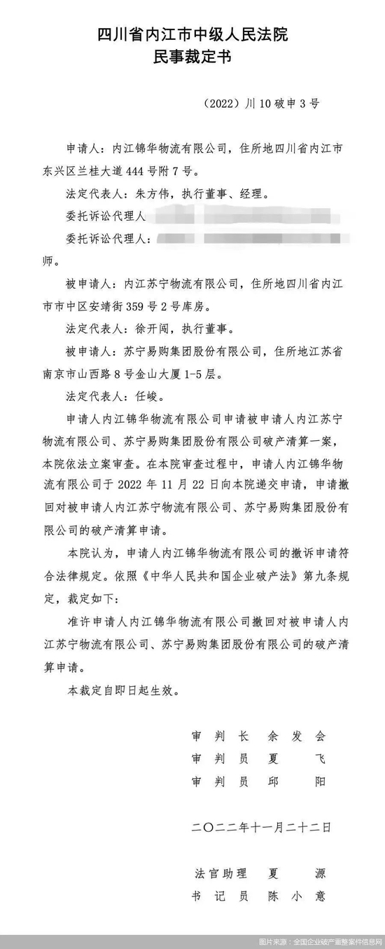 尽管根据据中城院要案中心官网消息,截至11月22日上午10点,在苏宁将欠款付清后,该案申请人内江锦华物流有限公司已向法院申请撤回申请。相关民事裁定书如下: