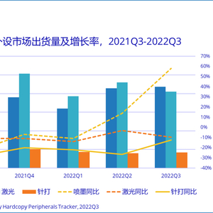 IDC 发布报告称,2022 年第三季度,中国打印外设市场出货量为 465.0 万台,同比增长 12.7%。其中,喷墨打印机出货量 218.0 万台,同比增长 58.2%;激光打印机出货量 205.0 万台,同比下降 9.7%;针式打印机出货量 41.9 万台,同比下降 12.3%。