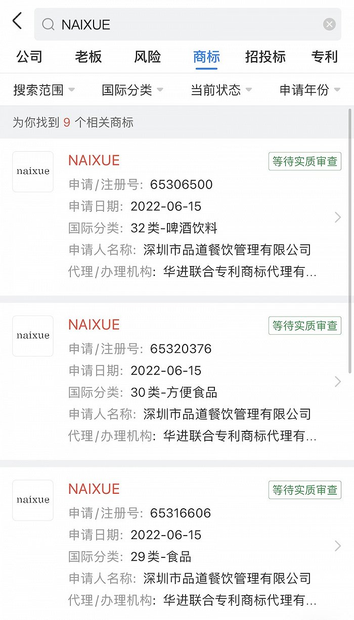 奈雪早就想改名了。天眼查APP信息显示,早在今年6月奈雪的茶所属公司深圳市品道餐饮管理有限公司便集中申请了一系列“NAIXUE”商标,分类包括啤酒饮料、食品等。就目前而言,奈雪的改名才刚刚开始,起码其小红书官方客服评论回复时,仍顶着旧Logo图片,在微博、抖音、大众点评等平台上,奈雪也尚未更改VI。