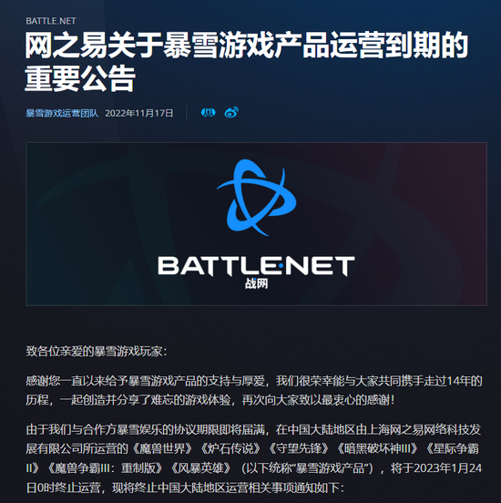 11月17日,暴雪战网中文官网发布一则“网之易关于暴雪游戏产品运营到期的重要公告”,公告中称由于网之易与合作方暴雪娱乐的协议期限即将届满,在中国大陆地区由上海网之易网络科技发展有限公司所运营的《魔兽世界》《炉石传说》《守望先锋》《暗黑破坏神Ⅲ》《星际争霸Ⅱ》《魔兽争霸Ⅲ:重制版》《风暴英雄》将于2023年1月24日0时终止运营。