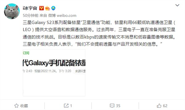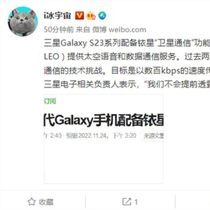 据知名数码博主@i冰宇宙 最新发布的信息显示,与此前曝光的消息基本一致,全新的三星Galaxy S23系列旗舰将支持铱星“卫星通信”功能,该功能可利用66颗低轨道通信卫星 ( LEO ) 提供太空语音和数据通信服务。据介绍三星过去两年一直在准备克服卫星通信的技术挑战,目标是以数百Kbps的速度传输文本消息和低容量图像等数据。而此前Mate 50系列仅支持北斗短报文功能,iPhone 14系列则依托全球星系统为用户提供卫星通信服务。