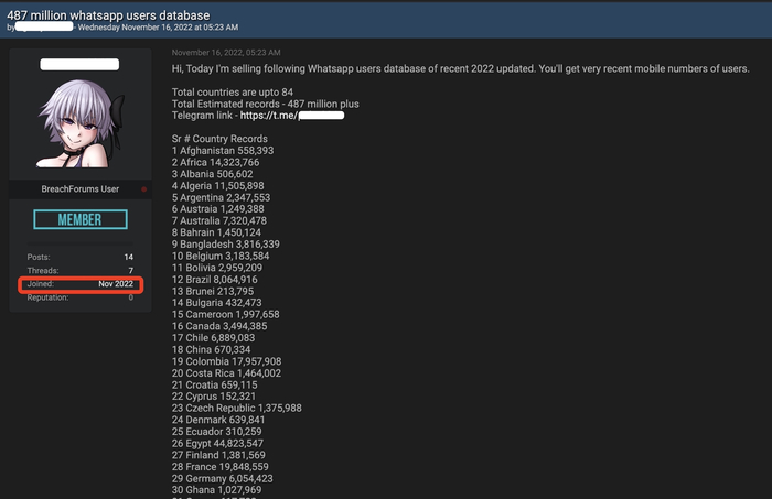 据该用户的发帖,上述数据涉及84个国家和地区,其中约3200万来自美国,4500万来自埃及、3500万来自意大利、2000万来自法国。该用户表示,这些数据为“活跃WhatsApp用户的电话号码”,目前具体价格并未公开。值得注意的是,用户信息显示,该用户今年11月才加入该论坛。