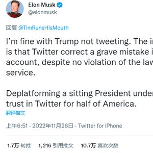“我对特朗普不发推特没有意见。重要的是,推特纠正了封禁其账户的严重错误,尽管这没有违反法律或服务条款,”马斯克在一条推文中称,“剥夺一位现任总统用社交平台表达观点的权利,破坏了半数美国人对推特的公众信任。”