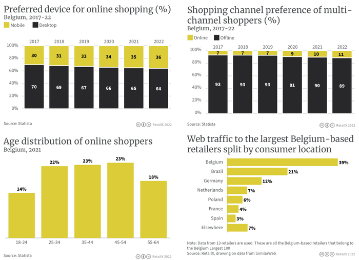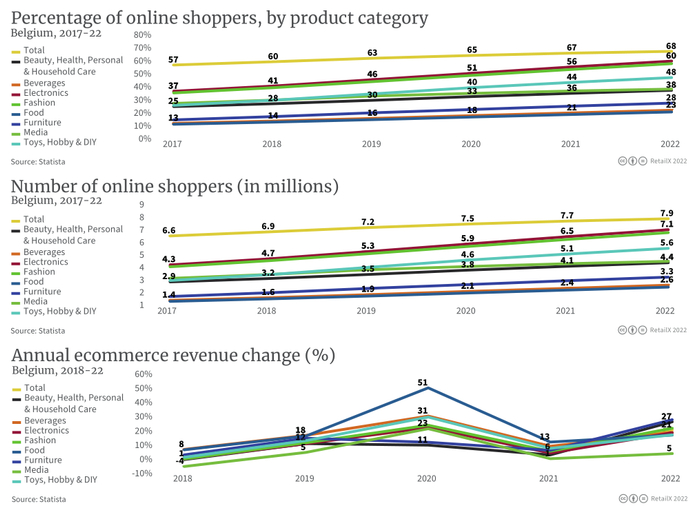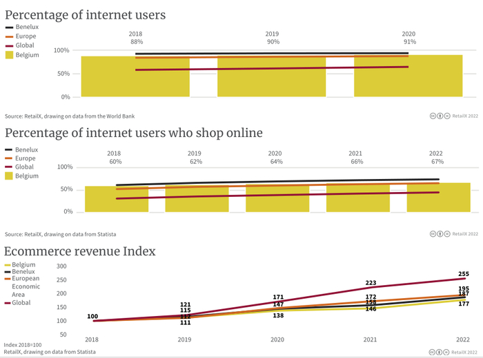 近年来,随着该国互联网普及率不断增加,线上消费人群也不断发展壮大。2018年,比利时只有60%的互联网用户进行线上购物。到2021年,这一比例增加到66%并继续上升。2022年,67%的互联网用户进行线上购物。这一数据虽然低于比荷卢地区的平均水平,但与整个欧洲的平均水平相当。
