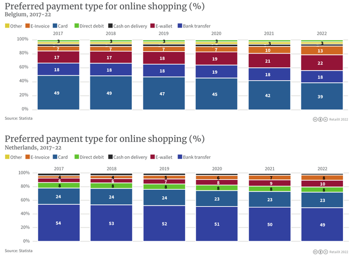 在比利时,电子钱包和电子发票的使用率也在增加。卡片支付仍然是39%比利时消费者的首选在线支付方式,低于2017年的49%。而在卢森堡,Payconiq旗下的Digicash正在成为常用的数字支付解决方案。