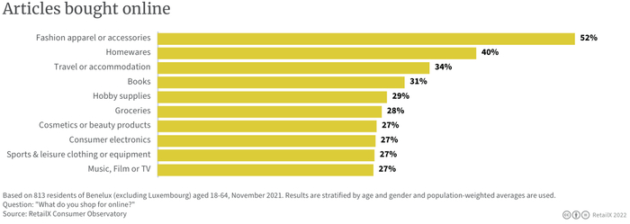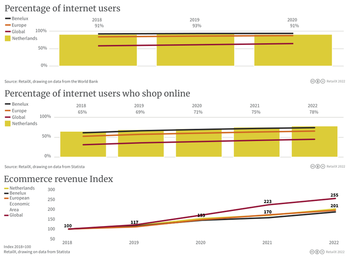尽管可能出现经济衰退,但预计荷兰的消费者将继续进行线上购物。近年来,电子商务越来越受欢迎,78%的互联网用户在2022年进行线上购物,这与前三年相比均略有上升。