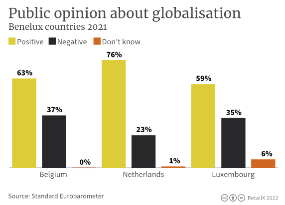 与比利时和卢森堡的同龄人相比,荷兰的消费者更有可能以积极的眼光看待全球化。59%的卢森堡消费者对全球化持积极态度,比利时和荷兰的这一比例分别为63%和76%。