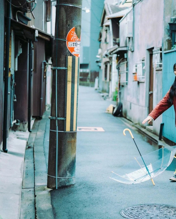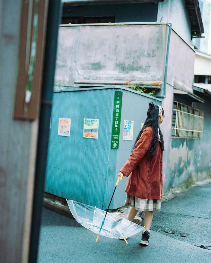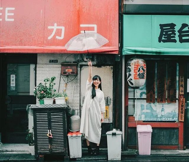 如若是探店或街拍,除半身照外,场景不过于杂乱的话,可以拍一拍撑伞的全身照。
