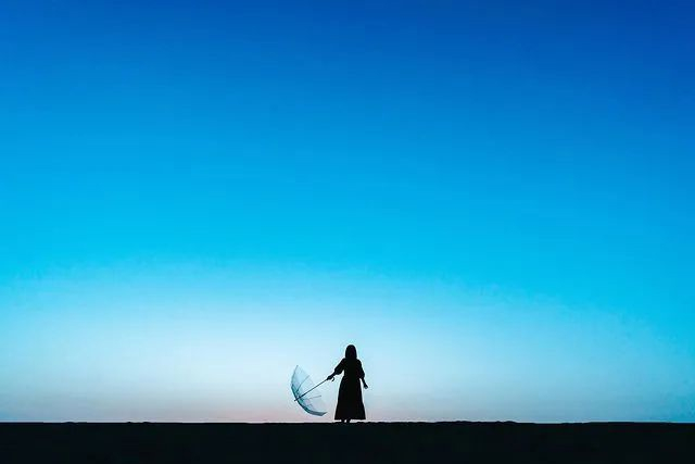 喜欢夏日黄昏之景的你,还可以借助蓝调时刻,拍摄富有意境的透明伞人像剪影照。