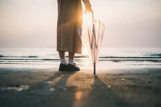 比如,在黄昏场景下,让夕阳光线照射在透明伞的伞面上,模特侧脸对着夕阳~