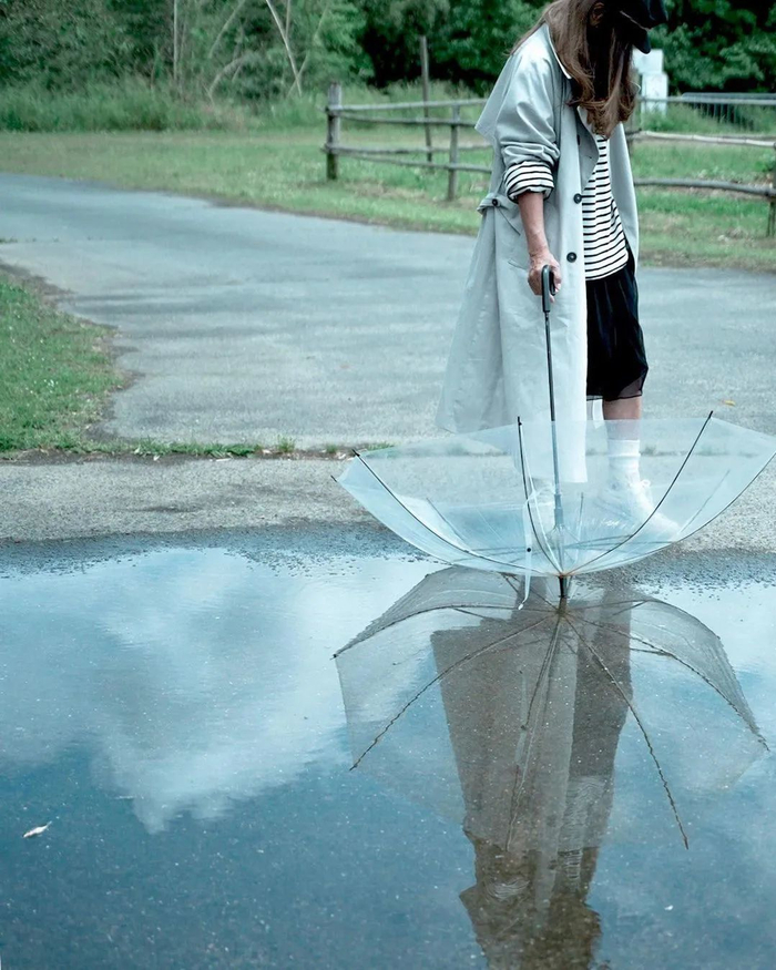 当遇到一些水坑场景时,模特拿着收起的透明伞,以水面为镜面,即可拍出唯美有意境的倒影照。