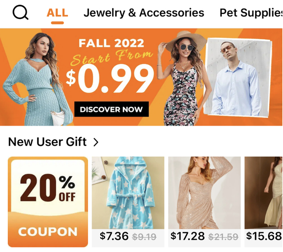 而在消费者一端,Temu更是低价抢占市场。平台上的夏季女装价格多在20美元以下,项链、戒指的价格在5-10美元的区间内,一些小物件甚至低到1美元以下。一位在亚马逊平台上做出口的从业者吐槽,Temu的零售价比他们的进货价还便宜。