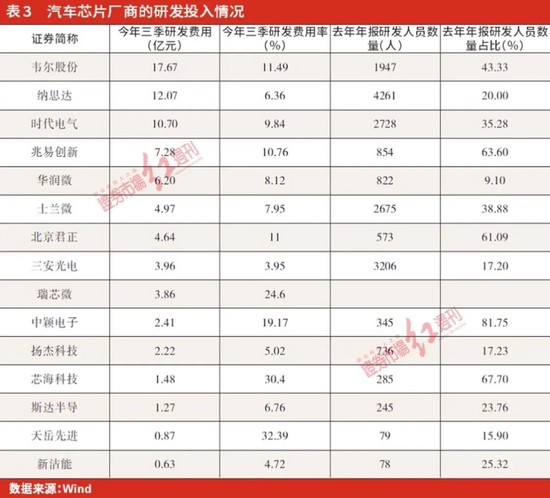 《红周刊》从近期美国半导体行业协会(SIA)发布的报告中看到,美国半导体公司将年收入的约1/5用于研发,2021年达到502亿美元。《红周刊》梳理多家车规级半导体厂商研发数据相关情况,从今年三季报的数据来看,韦尔股份的研发费用高达17.67亿元,研发费用率占比最高的是天岳先进,占比为32.39%,有多家公司的研发费用率低于20%(见表3)。