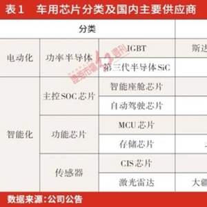 目前,汽车半导体市场主要由海外大厂主导,国产车崛起和国内厂商加快布局带来各细分赛道国产替代机遇。由于汽车芯片种类繁多,《红周刊》按照受益于电动化和智能化两大类,分别梳理其中的芯片厂商的布局和投产情况(见表1)。
