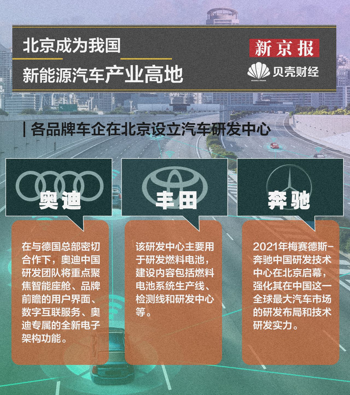 除了产能提升,北京还是国内最大的新能源汽车研发、应用中心,成为我国新能源汽车产业高地。多家车企在北京设立研发中心,着力发展北京汽车市场。除了当前的新能源产业布局外,未来北京还将重点发展氢能。