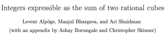 就在 10 月下旬发表的一篇论文中,三位数学家 Levent Alpöge、Manjul Bhargava 和 Ari Shnidman 证明了至少有 2/21(约 9.5%)和最多 5/6(约 83%)的整数可以写成两个分数的立方之和。值得一提的是,论文作者之一 Manjul Bhargava 在 2014 年因其对椭圆曲线研究做出的贡献而获得菲尔兹奖。