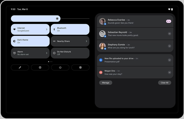 而在安卓 12L 开始,谷歌就为平板等大屏幕设备的通知栏引入了两列布局,以此充分利用空间。锁屏也使用更大的两列布局来突出显示通知和时钟,此外还优化了“设置”等系统应用。