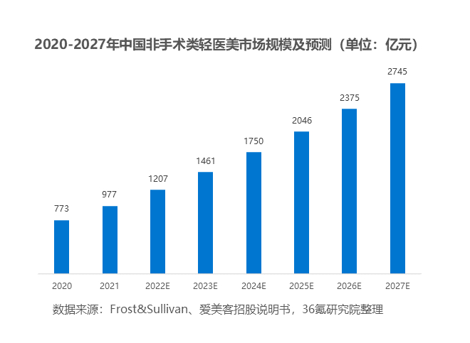 丰富的产品矩阵和多元的消费者群体为轻医美行业发展带来新增量。Frost&Sullivan和爱美客招股说明书数据显示,预计到2027年,我国非手术类轻医美市场规模有望达到2,745亿元,较2021年增长1.8倍。