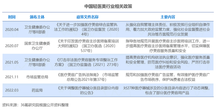 处于快速发展阶段的轻医美行业,存在部分机构资质不明、宣传效果虚假、价格不透明等问题,损害消费者与业内正规机构的利益,阻碍行业长期发展。在此背景下,我国从深度和广度两方面出台相关法律法规,加强行业监督管理。在深度方面,2021年,市场监管总局出台《医疗美容广告执法指南》,深入管理行业虚假、夸大宣传等问题,监管更为精准;在广度方面,国家陆续出台多部法律,覆盖上游产品的器械资质、产品宣传,中游医美机构的经营资质,下游产品服务推广等方面,已完成对产业链的全面监管。政策的出台和落地规范了我国轻医美行业参与者行为,减少行业乱象,为行业指明了健康的发展方向。